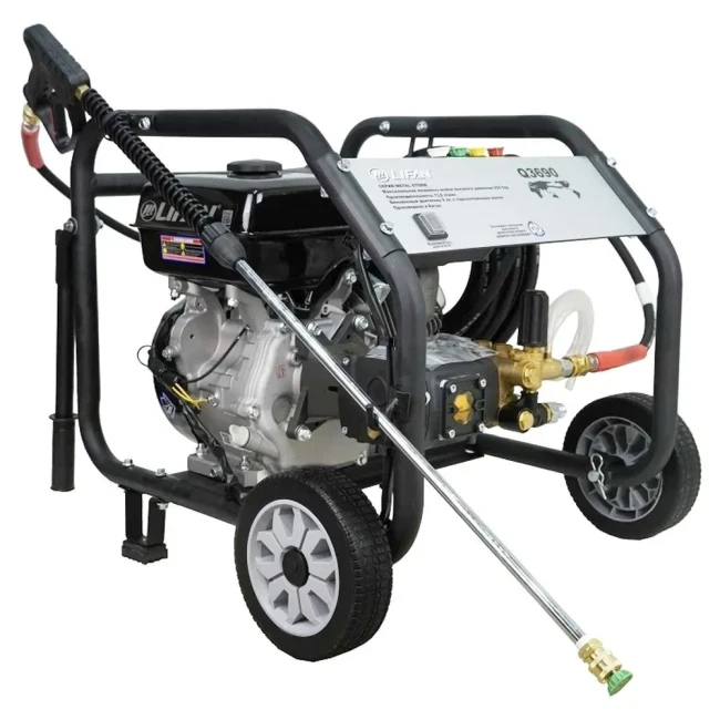 Бензиновая мойка высокого давления модели LIFAN Q3690 предназначена для очистки загрязнения с любых вертикальных и горизонтальных поверхностей большей площади за счет высокой производительности струей воды давлением до 250 бар. Высокую надежность и бесперебойность работы данной модели обеспечивают насосом высокого давления итальянской торговой марки Annovi Reverberi с прямым приводом и двигатель LIFAN модели 177F-B (9л.с.). Входящие в комплект поставки пневматические резиновые колеса размером 4.10/3.50-4 и Т-образная ручка с фиксатором наклона обеспечивают удобство транспортировки и хранения. Также мойка укомплектована шлангом высокого давления и пистолетом-распылителем с регулировкой формы выходной струи.